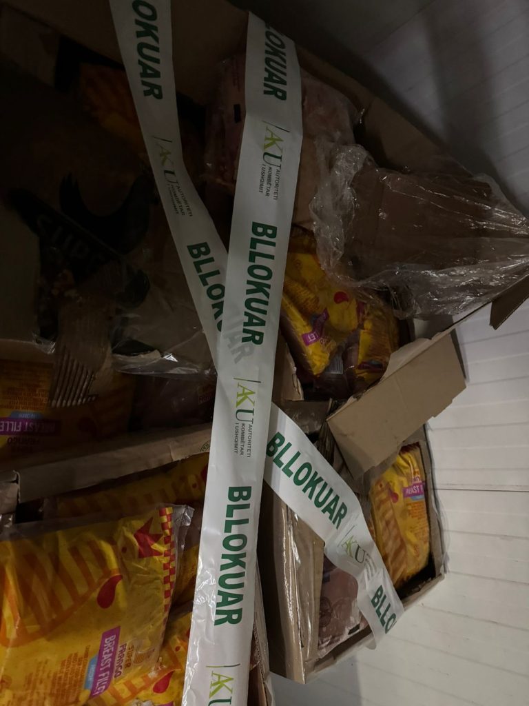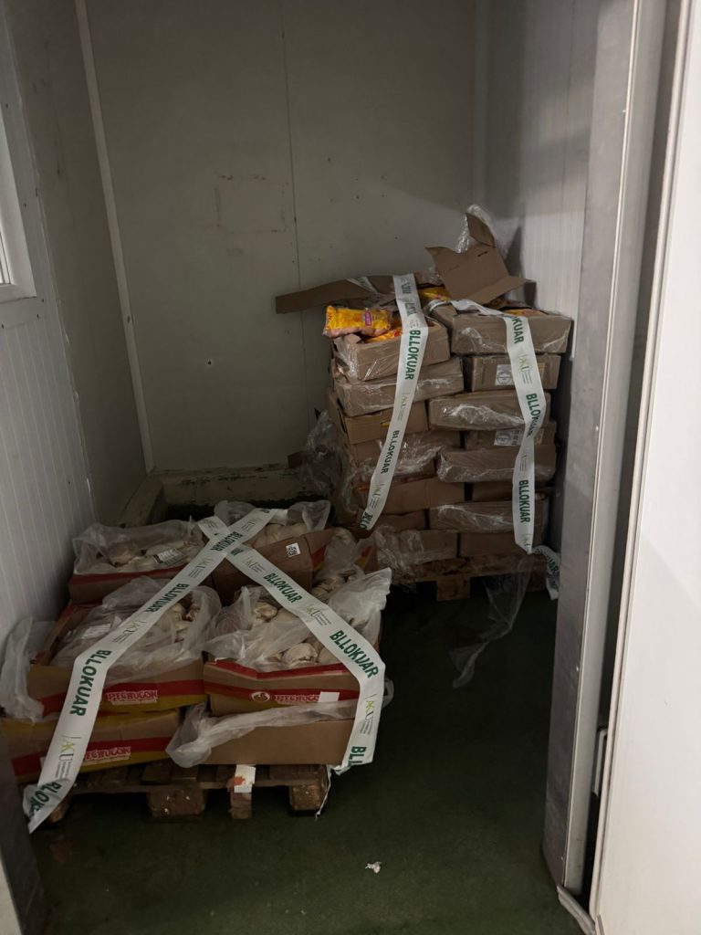 “Gjithashtu, gjatë kontrollit në subjektin “KMY” (Përpunim mishi), u konstatua një ambient ndihmës me kushte higjieno-sanitare të papërshtatshme, ku procesi i shkrirjes së produkteve kryhej në kundërshtim me normat teknike. Për këtë arsye, u vendos masa e bllokimit për ambientin ndihmës si dhe bllokimi i sasive të produkteve: 588 (pesëqind e tetëdhjetë e tetë) kg fileto pule “Super Frango”; 150 (njëqind e pesëdhjetë) kg gjoks pule “Pechungon”.”, njofton AKU.