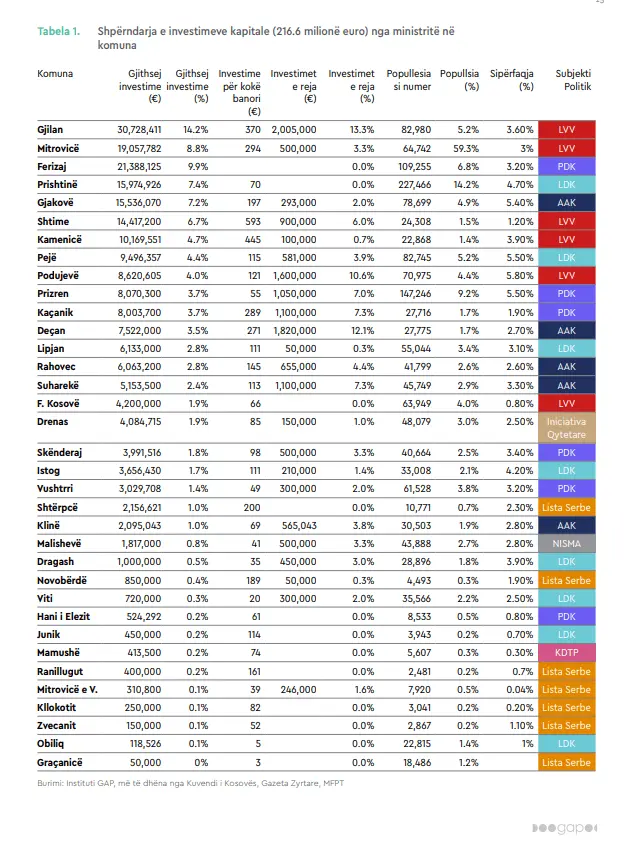 GAP thekson se shpërndarja e investimeve nga niveli qendror nuk është proporcionale me popullsinë dhe sipërfaqen e komunave. Komunat e udhëhequra nga Lëvizja Vetëvendosje përfitojnë 40.3 për qind të investimeve totale, ndërsa Lidhja Demokratike e Kosovës merr vetëm 17.3 për qind, pavarësisht përfaqësimit të saj më të lartë në popullsi.