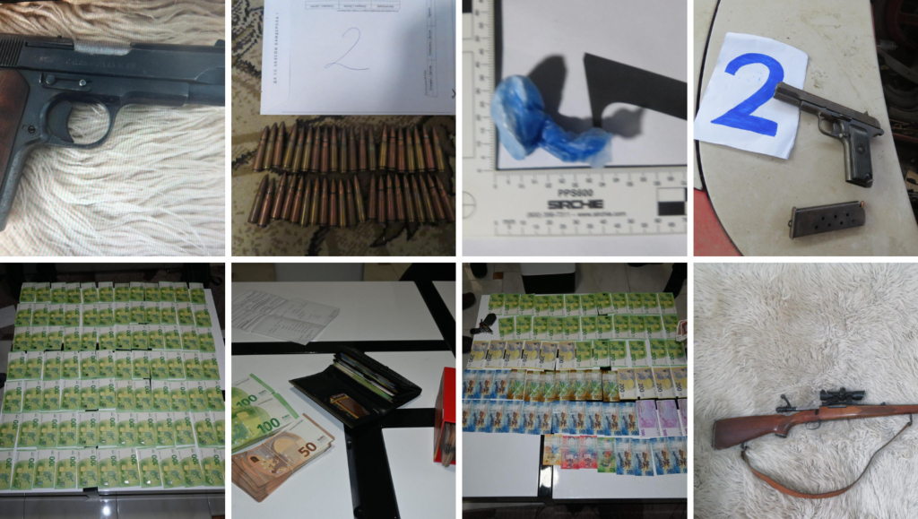 “Me këtë rast, tek I.J. janë gjetur pesë pako me një materie pluhurore të bardhë, 52 fishekë të një pushke automatike e kalibrit 7.62, dy fishekë të një pistolete e kalibrit të panjohur dhe një gëzhojë e një pushke automatike. Te S.Z. (36) janë gjetur dhe sekuestruar 20 fishekë të një pushke automatike e kalibrit 7.62, një pistoletë dhe krehër me dy fishekë të cilat i posedonte pa leje, si dhe një peshore digjitale me mbetje të një materie pluhurore të bardhë. Te D.P. (69) janë gjetur dhe sekuestruar një pistoletë të cilën e posedonte pa leje, si dhe një karabinë gjuetie, një pushkë gjuetie dhe një pistoletë të cilat i posedonte me leje. Te D.P. (65) janë gjetur dy lista dhe një fletore me emra disa personave, dy kompjuterë dhe rreth 31.640 euro, 3.400 franga zvicerane dhe 56.500 denarë. Te S.Z. (42) është gjetur një materie pluhurore e bardhë”, sqaroi Ministria e Brendshme.