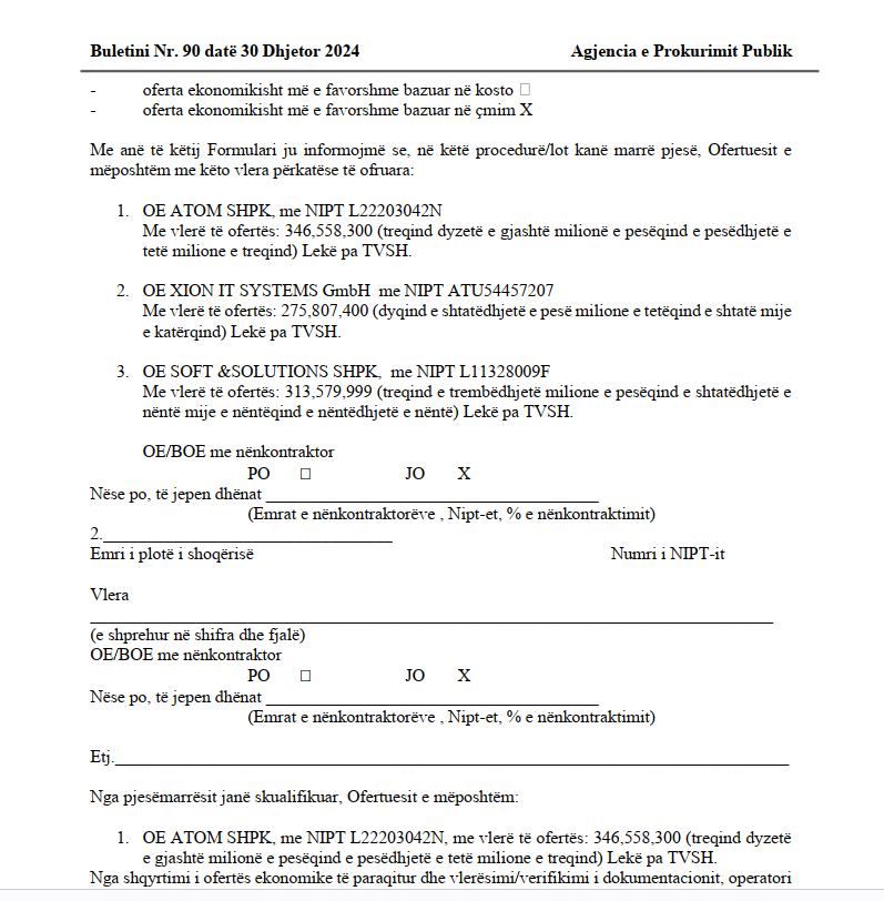 Sipas PD, në Tetor 2024 shpallet fituesi SOFT & Solution shpk në pronësi të Ermal Beqiraj me vlerë të ofertës 3.1 mil euro, ndërsa u skualifikuan dy kompani te tjera.