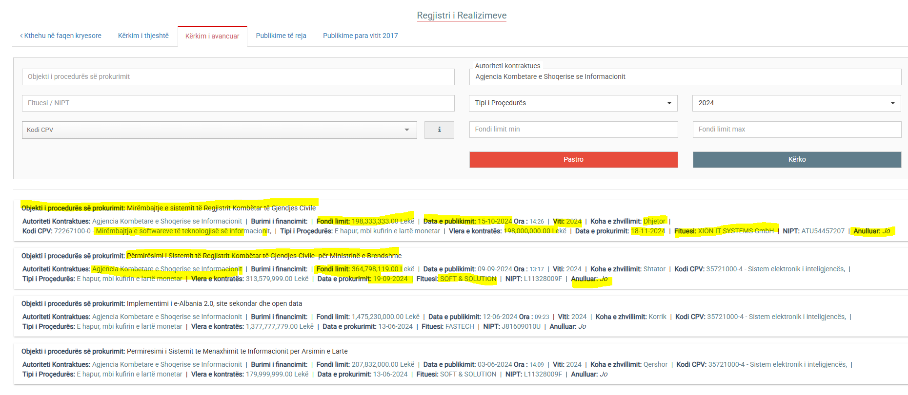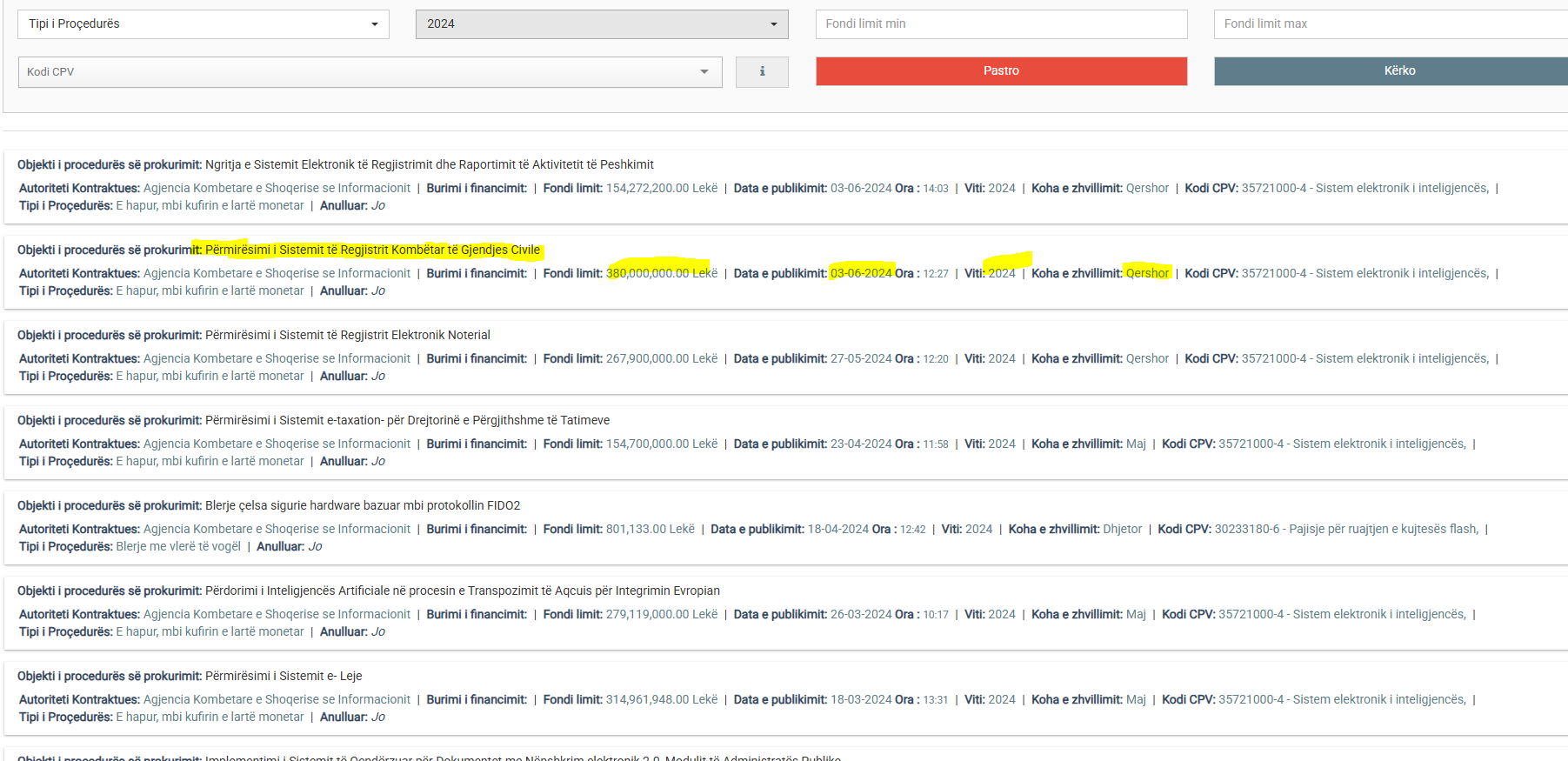 Në Qershor të v. 2024 AKSHI shpalli procedurën e prokurimit me objekt: ‘Përmirësimi i Sistemit të Regjistrit Kombëtar të Gjendjes Civile’ me fond limit 3.8 mil euro e cila u anullua me arsyetimin se nuk u paraqit asnjë ofertë e përshtatshme.