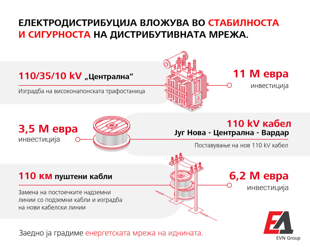 Një projekt i madh që aktualisht po realizohet në qendër të Shkupit është trafostacioni i tensionit të lartë 110/35/10 kV “Qendror”, në ndërtimin e të cilit deri tani janë investuar 11 milionë euro.