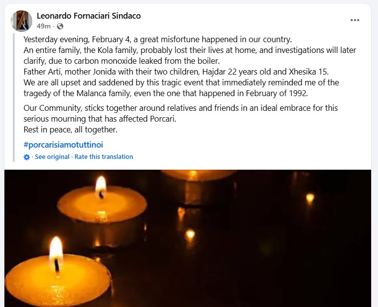 “Jemi të gjithë të mërzitur dhe të trishtuar nga kjo ngjarje tragjike që më kujtoi menjëherë tragjedinë e familjes Malanca, madje edhe atë që ndodhi në shkurt të vitit 1992. Komuniteti ynë, qëndron i bashkuar rreth të afërmve dhe miqve në një përqafim ideal për këtë zi të rëndë që ka prekur Porcarin. U prehshin në paqe”, shkruan Fornaciari.