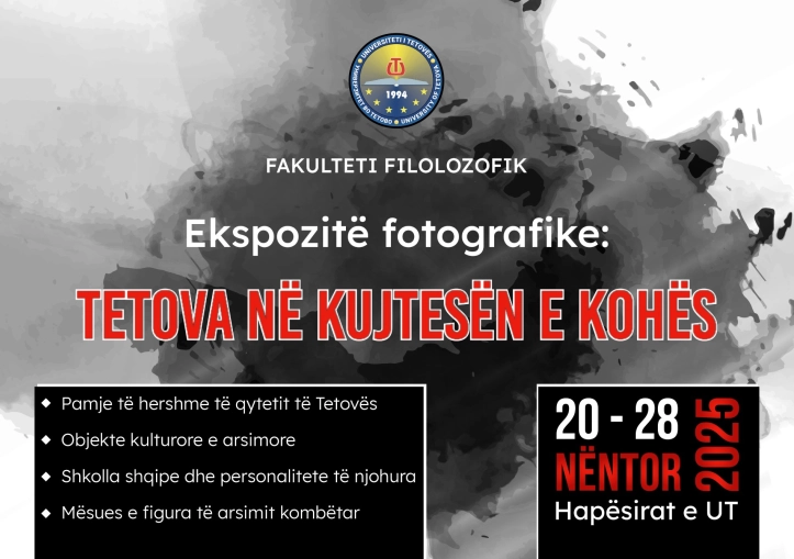 Më 20 nëntor 2025, Fakulteti Filozofik do të shënojë Ditën Botërore të Filozofisë, ngjarje që synon të thellojë debatin mbi mendimin filozofik dhe rolin e filozofisë në shoqërinë moderne. Në këtë aktivitet do të marrin pjesë Akademik Prof. Dr. Ferid Muhiq dhe Prof. Dr. Metin Izeti, të cilët do të ndajnë mendimet e tyre mbi aktualitetin e filozofisë dhe ndikimin e saj në zhvillimin intelektual e kulturor të njeriut. Paralelisht, Fakulteti Filozofik i Universitetit të Tetovës do ta organizojë ekspozitën fotografike me temë “Tetova në kujtesën e kohës”, e cila do të jetë e hapur për publikun nga 20 deri më 28 nëntor 2025 në hapësirat e UT-së. Ekspozita do të paraqesë pamje të hershme të qytetit të Tetovës, objekte kulturore e arsimore, shkolla shqipe dhe personalitete të njohura, si dhe mësues e figura të arsimit kombëtar. Synimi i saj është të risjellë në kujtesën kolektive trashëgiminë historike, arsimore dhe kulturore të Tetovës. UT vazhdon traditën e nderimit të datave të rëndësishme kombëtare me aktivitete kushtuar, 22 Nëntorit – Ditës së Alfabetit të Gjuhës Shqipe dhe 28 Nëntorit – Ditës së Flamurit dhe Pavarësisë së Shqipërisë.