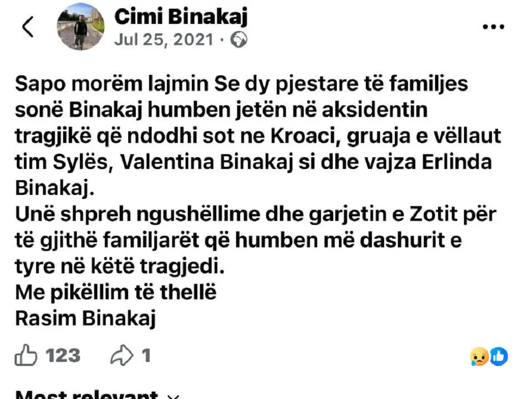 Rasim Binakaj, 38-vjeçari i cili mbeti i vrarë nga ar.ma e zjarrit, është xhaxhai i ish-finalistes së Big Brother VIP Kosova 4, Elijona Binakaj.