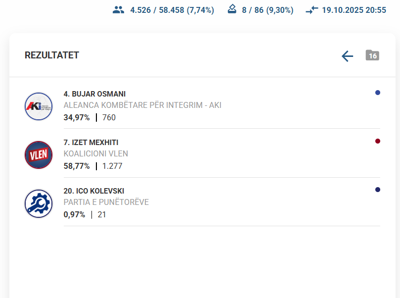 Komisioni Shtetëror Zgjedhor ka filluar me numërimin e votave. Nga 4.526 vota të numëruar deri tani, Izet Mexhit nga koalicioni VLEN ka 1.277 vota, ose 58,77%, ndërsa Bujar Osmani nga koalicioni AKI- ka 760 vota ose 34.97% të votave.