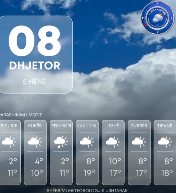 Në orët e para të 24- orëshit deri në mëngjes vranësirat në relievet malore në lindje të pasohen me reshje shiu me intensitet të ulët.
