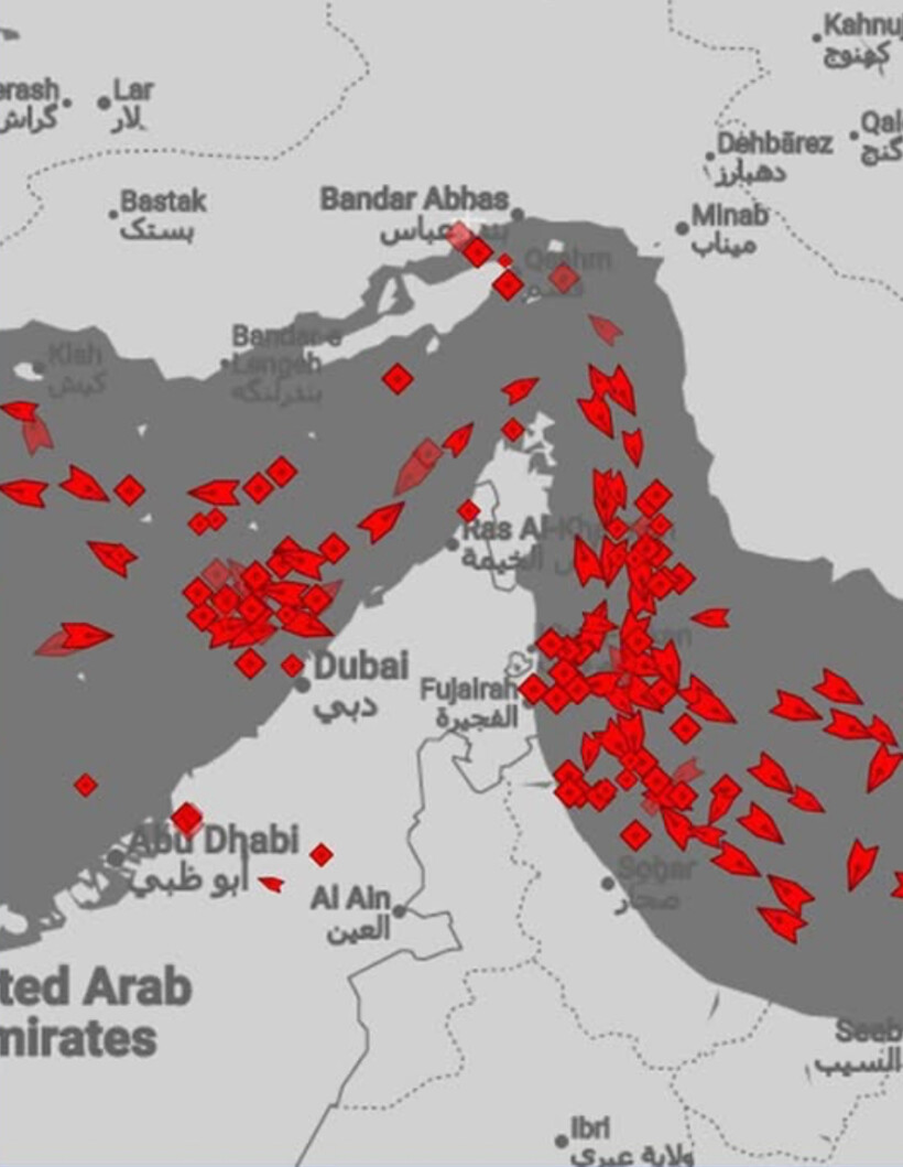 Qarkullimi përmes Ngushticës së Hormuzit u mbyll në mënyrë efektive më 28 shkurt, pasi anijet morën transmetime përmes radios VHF nga Garda Revolucionare e Iranit, ku thuhej se asnjë anije nuk lejohet të kalojë, sipas një zyrtari të misionit detar të Bashkimit Evropian Aspides. Të gjitha anijet e dukshme në hartë janë cisterna karburanti që transportojnë LNG dhe naftë bruto.