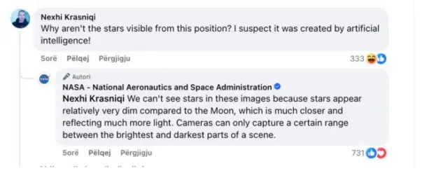 Në faqen zyrtare të NASA, një shqiptare e Kosovës, e identifikuar në rrjetet sociale si Nexhi Krasniqi, ka hedhur dyshime se pamjet janë të krijuara me inteligjencë artificiale. Kjo ka shkaktuar një reagim të menjëhershëm nga agjencia hapësinore, e cila ka vendosur të sqarojë situatën.