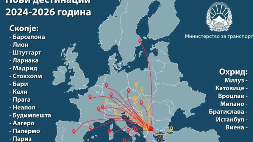 Janë hapur 22 linja të reja ajrore që e lidhin Maqedoninë me të gjithë Evropën, thotë zëvendëskryeministri dhe ministër i Transportit Aleksandar Nikolloski në një postim në rrjetet sociale, duke ndarë një hartë me linjat ajrore të reja të vendosura drejt Evropës nga dy aeroportet vendase nga viti 2024 deri në vitin 2026.