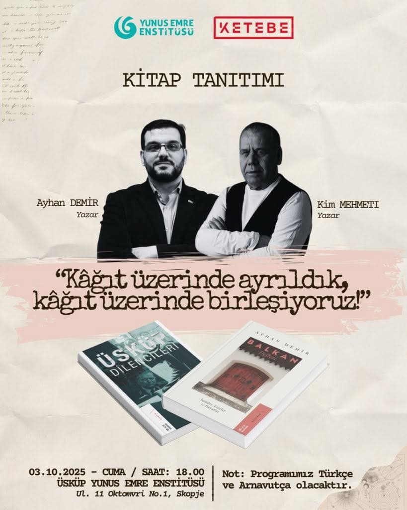 Instituti Yunus Emre në Shkup do të hapë dyert për një takim të veçantë letrar më 3 tetor 2025 (e premte), ora 18:00. Nën moton “U ndamë në letër, po bashkohemi në letër”, dashamirët e fjalës së shkruar do të kenë mundësinë të takohen me dy prej autorëve më të njohur të rajonit, të cilët do të ndajnë krijimtarinë e tyre dhe përvojat në letërsi.