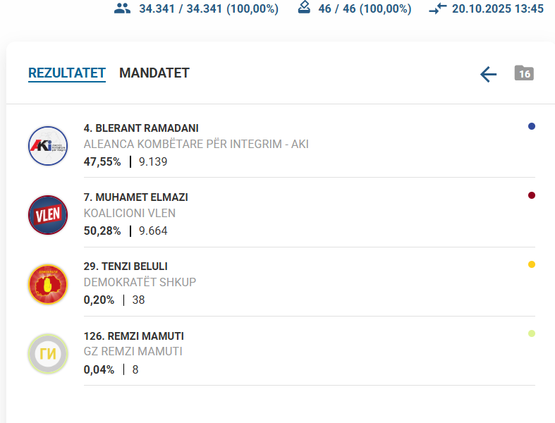 - Kumanovë: Mesut Bajrami si kandidat i pavarur ka arritur të grumbullojë rreth 1 mijë vota, VLEN 4 mijë