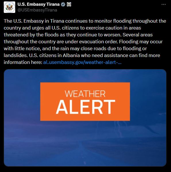 “Ambasada e Shteteve të Bashkuara në Tiranë po monitoron vazhdimisht përmbytjet në të gjithë vendin dhe u bën thirrje të gjithë shtetasve amerikanë të tregojnë kujdes maksimal në zonat e rrezikuara nga përmbytjet, të cilat po përkeqësohen. Disa zona në mbarë vendin janë nën urdhër evakuimi. Përmbytjet mund të ndodhin pa paralajmërim, ndërsa reshjet e shiut mund të shkaktojnë mbyllje rrugësh për shkak të përmbytjeve ose rrëshqitjeve të dheut”, thuhet mes të tjerash në njoftim.