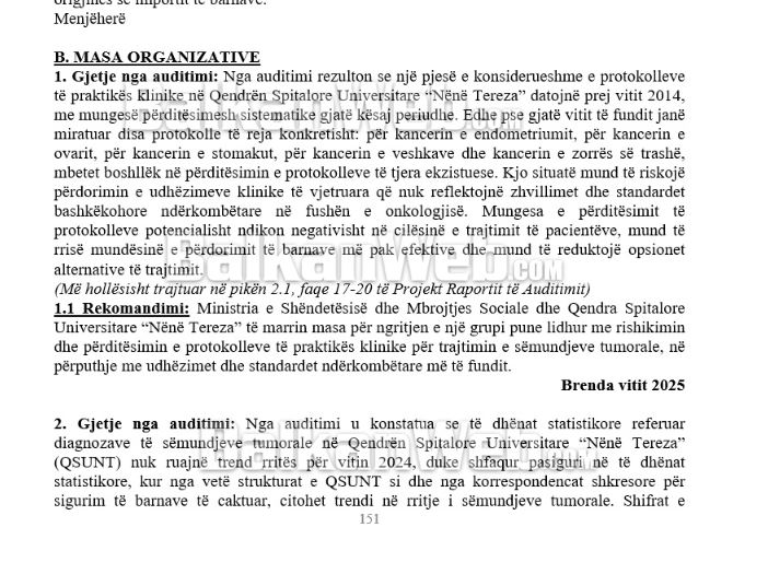 Kontrolli i Lartë i Shtetit shkon edhe më tej, duke theksuar se pjesa më e madhe e protokolleve mjekësore që përdoren sot në Onkologjik janë të vjetra më shumë se një dekadë. “Një pjesë e konsiderueshme e protokolleve të praktikës klinike në Qendrën Spitalore Universitare ‘Nënë Tereza’ datojnë prej vitit 2014, me mungesë përditësimesh sistematike gjatë kësaj periudhe,” – citon KLSH.