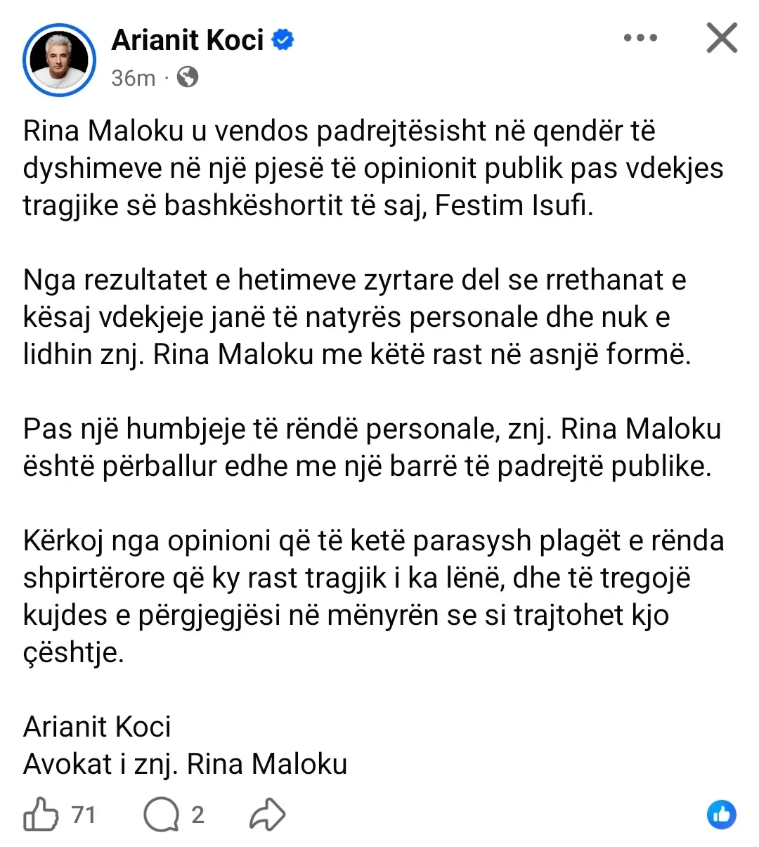 Reagimi i avokatit Koci në rrjetet sociale ka qenë i qartë dhe i drejtpërdrejtë. Ai theksoi se Rina ka qenë objekt i padrejtësive dhe aludimeve të pabaza pas vdekjes së partnerit të saj. Kjo situatë ka shkaktuar një barrë të rëndë emocionale për të, duke e bërë atë të përballet me një dhimbje të dyfishtë.