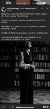 Njoftojmë se sot, më datë 23.4.2026 është ndarë nga jeta dhe është varrosur Rexhep Qosja.