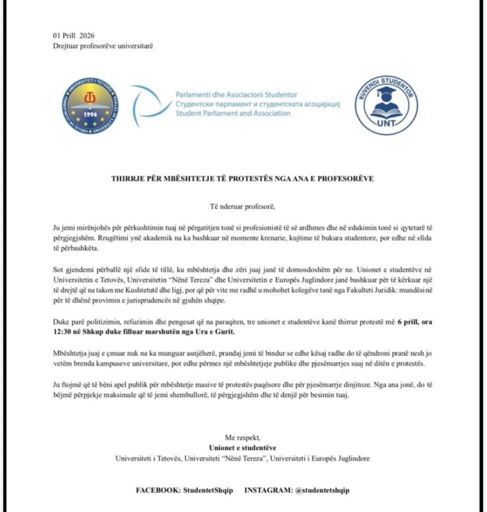 Unionet e studentëve nga Universiteti i Tetovës, Universiteti “Nënë Tereza” dhe Universiteti i Evropës Juglindore kanë dalë me një thirrje publike drejtuar profesorëve universitarë, duke kërkuar mbështetje për protestën në Shkup e paralajmëruar më 6 prill, në ora 12:30.