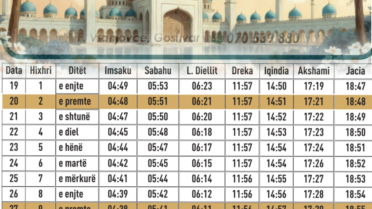 Tabela e publikuar më poshtë paraqet oraret e sakta të syfyrit dhe iftarit për secilën ditë të Ramazanit, sipas vaktisë zyrtare që vlen për territorin e Maqedonisë së Veriut. /Telegrafi/