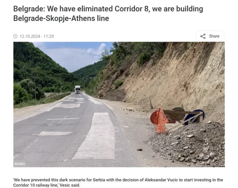 Kryetari i Aleancës për Shqiptarët, Zijadin Selës ka akuzuar sot se urdhri për ndërprerjen e Korridorit 8 vjen nga Beogradi, konkretisht nga presidenti serb, Aleksandar Vuçiq. Akuzat e tij, Sela i ka argumentuar me një deklaratë të ministrit të Transportit dhe Infrastrukturës së Sërbisë, Goran Vesic, të transmetuar nga Agjencia Bullgare e lajmeve, BGNES, në tetor të vitit 2024. Ministri serb kishte deklaruar atëherë , “Bashkimi Evropian e detyroi korridorin nga Bullgaria në Shqipëri, si dhe atë nga Rumania në Greqi. Ne e kemi parandaluar këtë skenar të errët për Serbinë me vendimin e Aleksandar Vuçiç për të filluar investimet në linjën hekurudhore të Korridorit 10”, ka thënë ai, duke shtuar se, Serbia duhet të luftojë që të bëhet qendra nëpër të cilin kalojnë të gjitha linjat hekurudhore. Artikulli i agjencisë bullgare shkruante në vitin 2024 se, zëvendëskryeministri dhe Ministri i Transportit i Maqedonisë së Veriut, Aleksandar Nikolloski, madje u përpoq t’i ridestinotet fondet e Korridorit 8 për Korridorin 10.